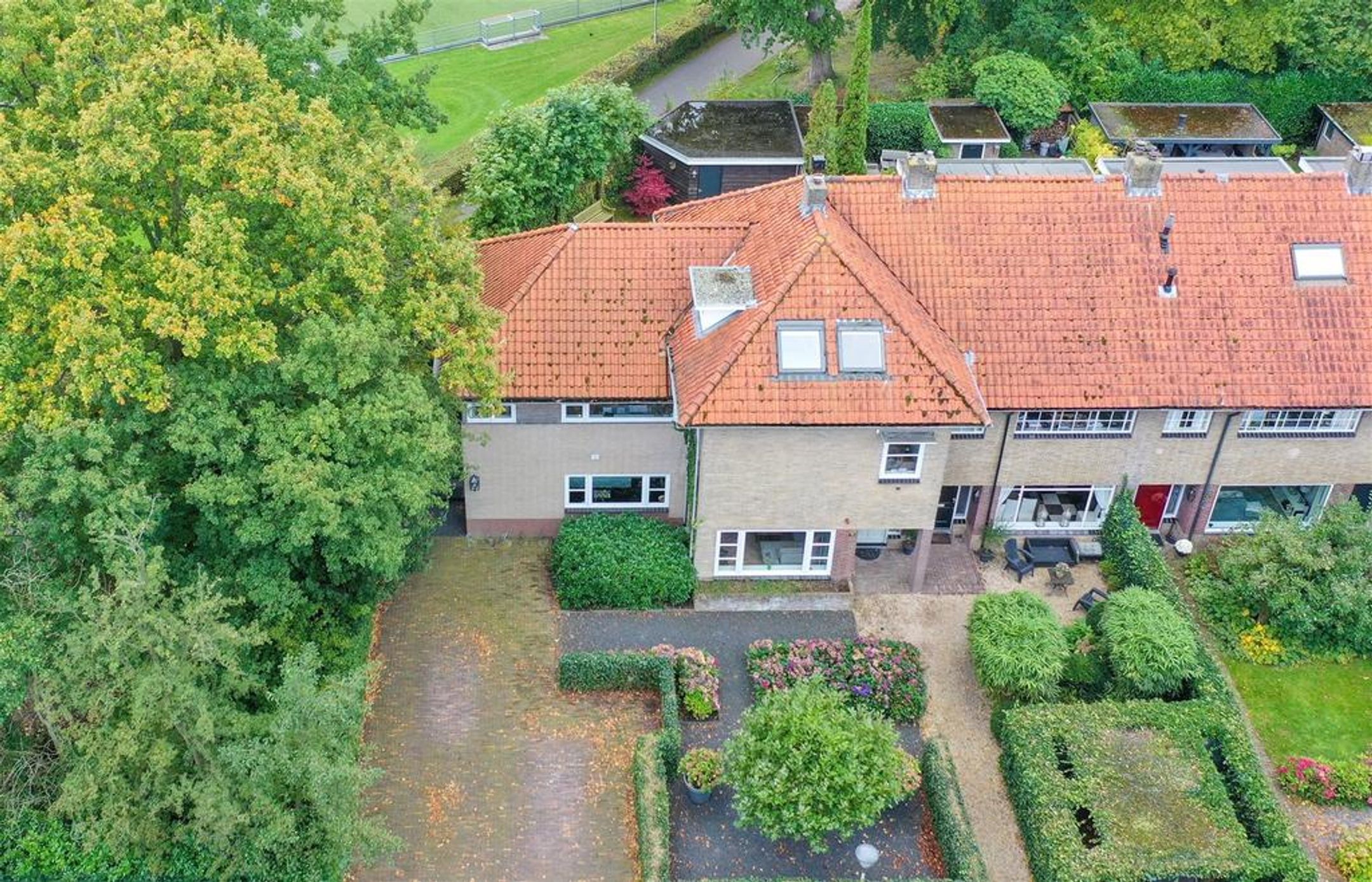 Een ruim perceel met fraai aangelegde voortuin, meerdere parkeerplaatsen, een afsluitbaar achterom, een besloten achtertuin met een ruim zonneterras op het zuiden en een voormalige garage als grote schuur.
