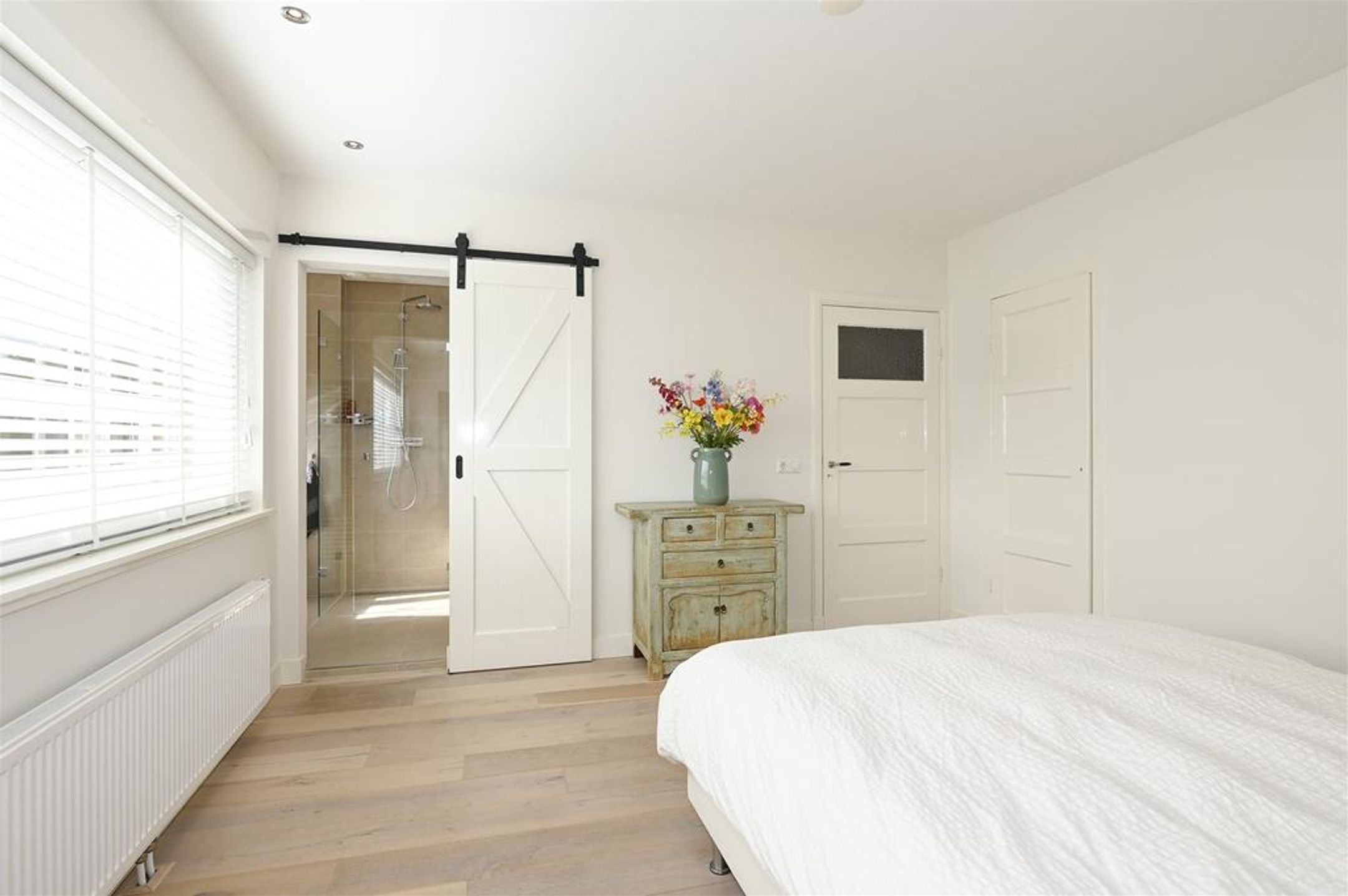 Overloop, 2 slaapkamers aan de voorzijde van het huis, een badkamer met douche, toilet en wastafel. De masterbedroom bevindt zich aan de achterzijde van het huis en heeft 2 inbouwkasten, een walk-in closet met veel kastruimte en een eigen badkamer met speelse schuifdeur, douche, toilet en wastafel.